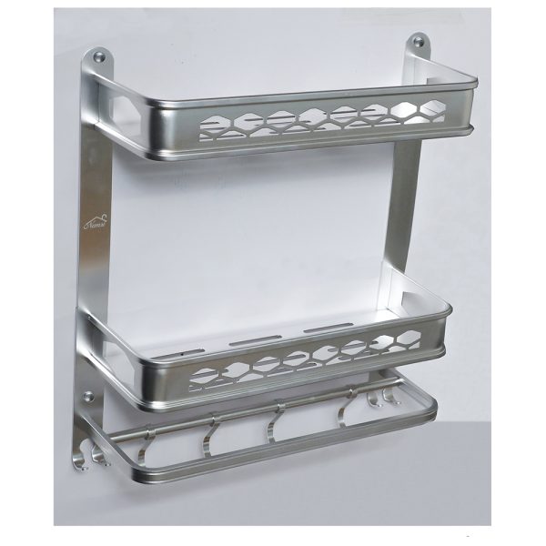 N343 – Aluminium Double Shelf with 8 hooks + Towel Bar – 40cm
